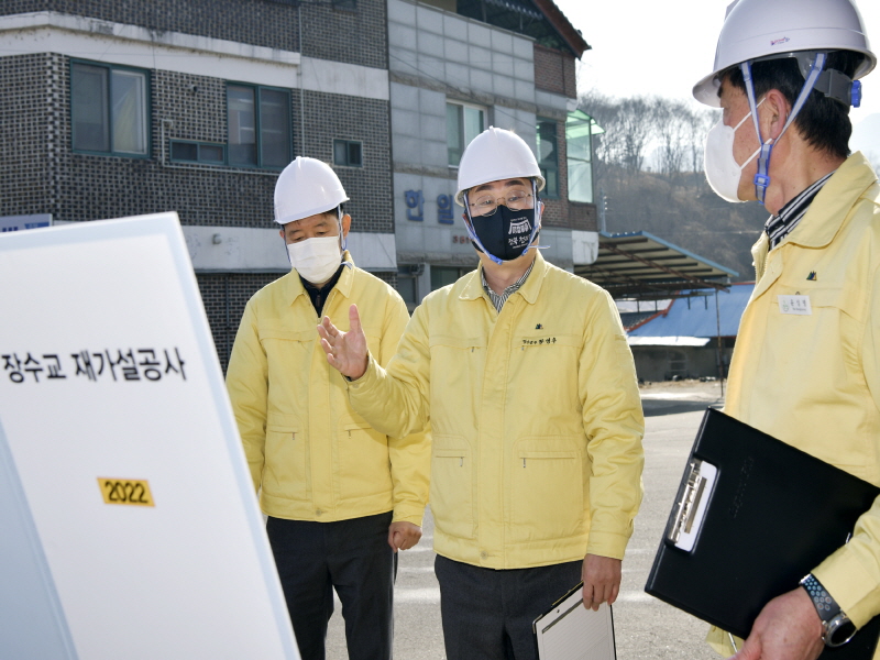 장영수 군수는 14일 장수교 재가설 건설공사 현장을 방문해 건설 추진 상황을 살피고 안전 기준 준수 여부 점검과 겨울철 공사 진행 과정에서 발생할 수 있는 화재, 건물 붕괴 등의 안전사고가 발생하지 않도록 안전 관리를 당부했다.
