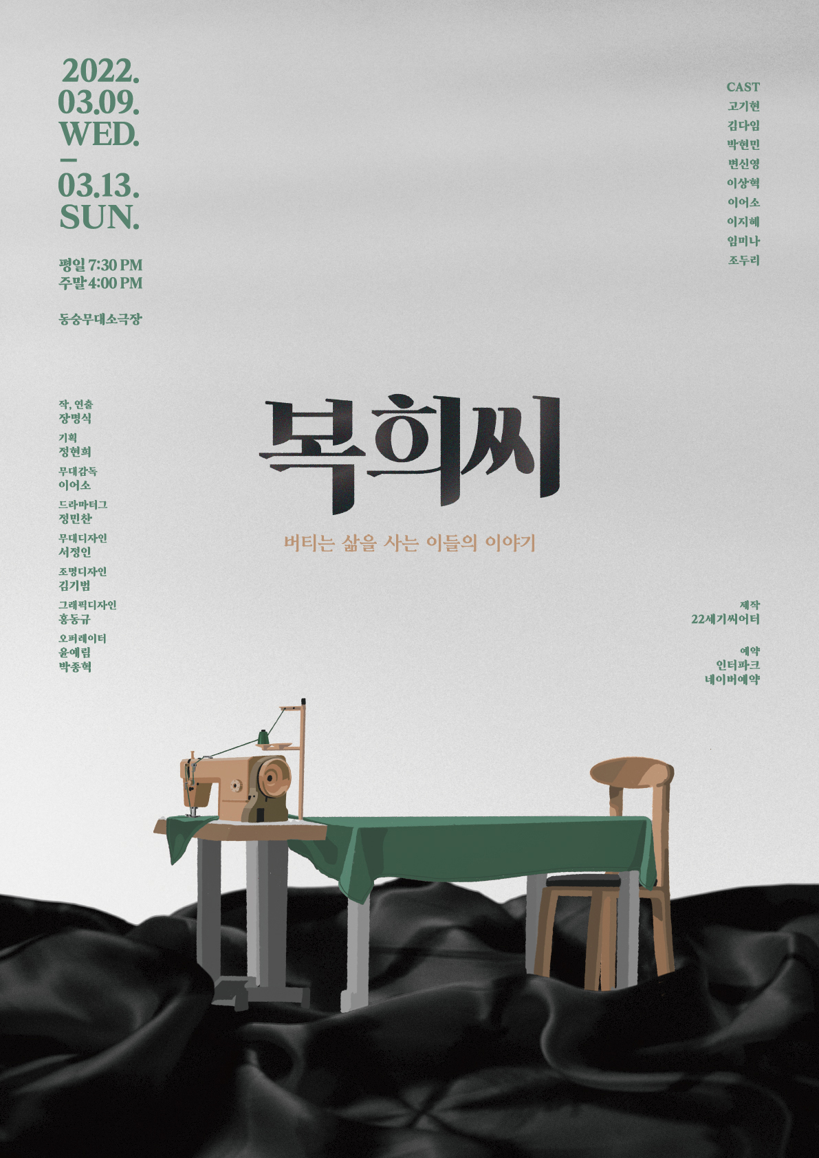연극 <복희씨>는 3월 9일부터 3월 13일까지 평일 7시 30분, 주말 오후 4시 대학로 동숭무대 소극장에서 공연된다.