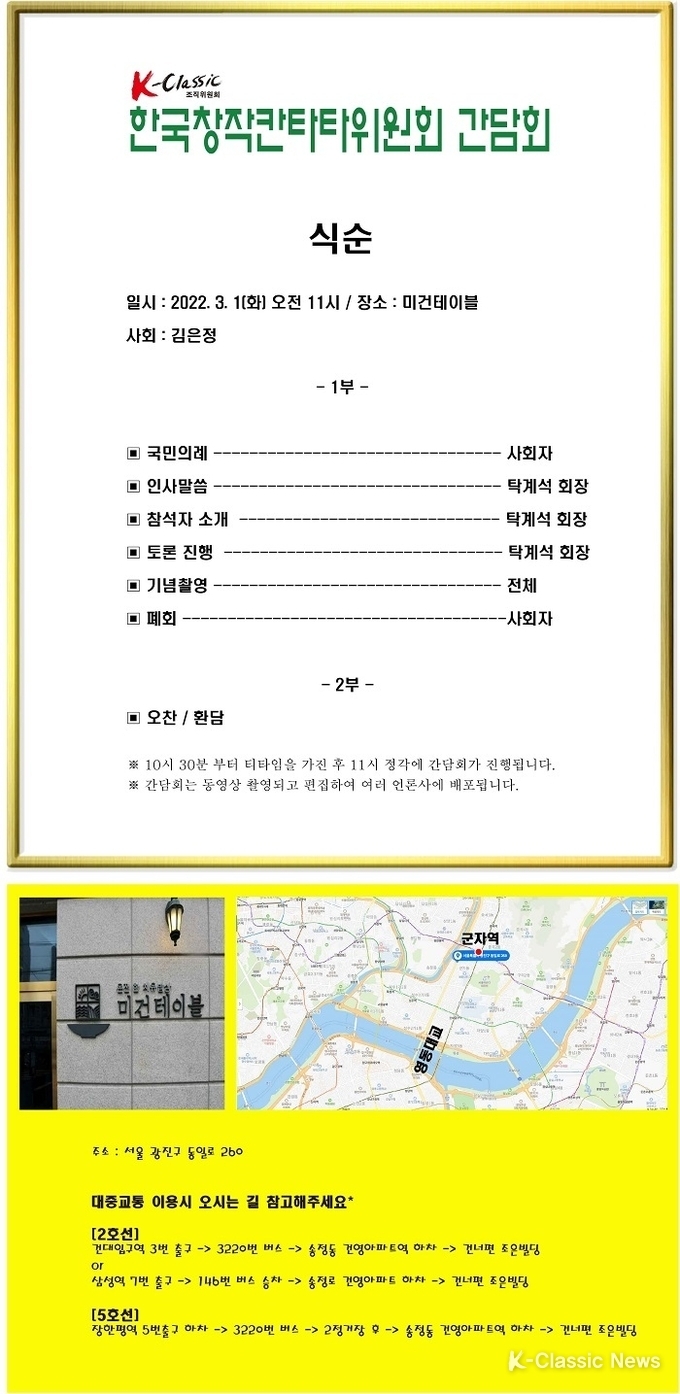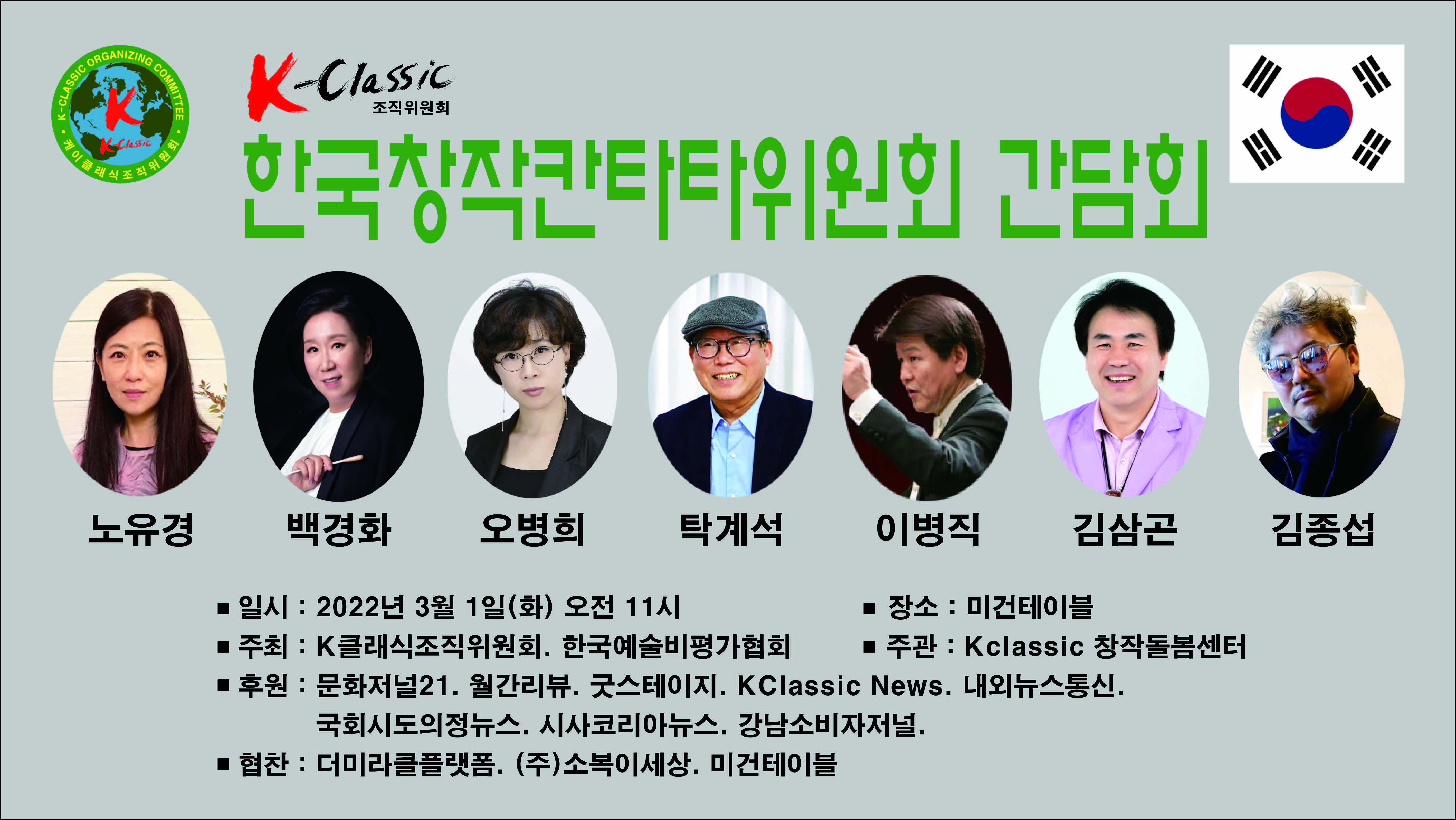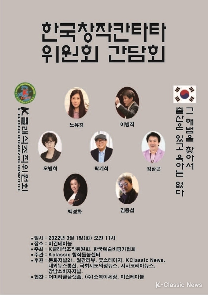 이런 한국 합창의 저력을 살리기 위해 칸타타 창작 합창 간담회를 갖는다. 모국어를 통한 합창의 지배력을 어떻게 사회화하는 가에 전문가들이 모인다. 오랜 합창계의 해묵은 숙제가 하루아침에 풀리지 않는다 해도 실타래를 푸는 인내로 , 문화 지성의 힘으로 해결해 나가고자 한다. 그 첫 출발이 때마침 3,1절 날이어서 문화독립 선언이라도 하고 싶다.