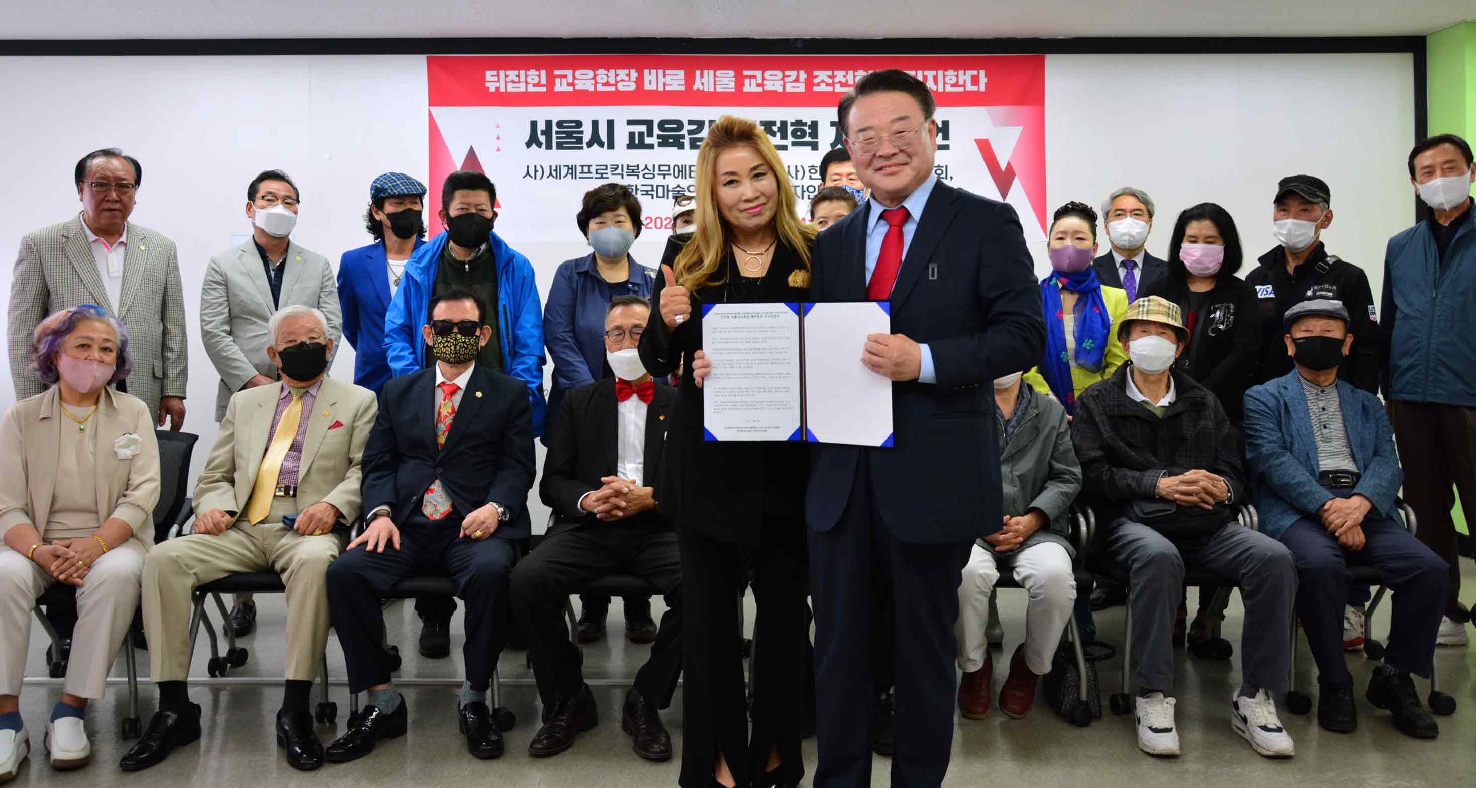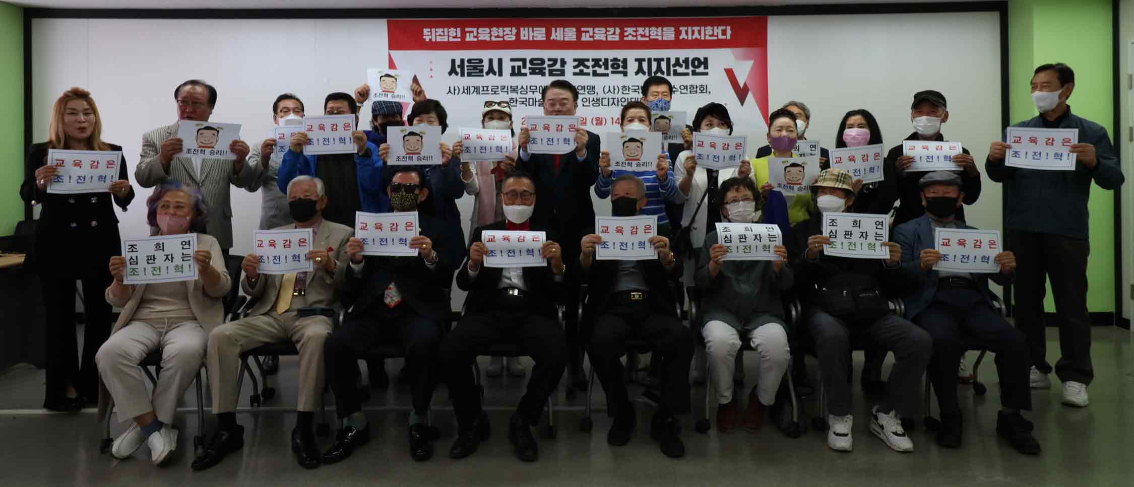 [강남구 소비자저널=김은정 대표기자] (사)세계프로킥복싱무에타이총연맹, (사)한국방송가수연합회, 한국마술인협회, 인생디자인대학 등 4개 단체는 10일 “조 후보가 이번 6·1 지방선거에서 좌편향 교육감을 심판할 유일한 중도·보수 대표선수임을 확신하고, 승리를 위해 함께 하겠다“며 조 서울시 교육감 예비후보 지지를 선언했다.