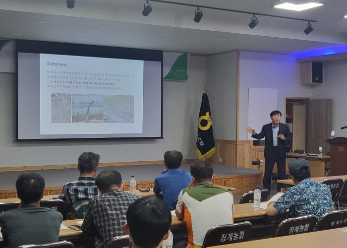 이날 교육은 장수 및 무주, 남원 관내 공선회원 50여명이 참석해 고품질 샤인머스켓 재배를 위한 교육 열기가 뜨거웠다.