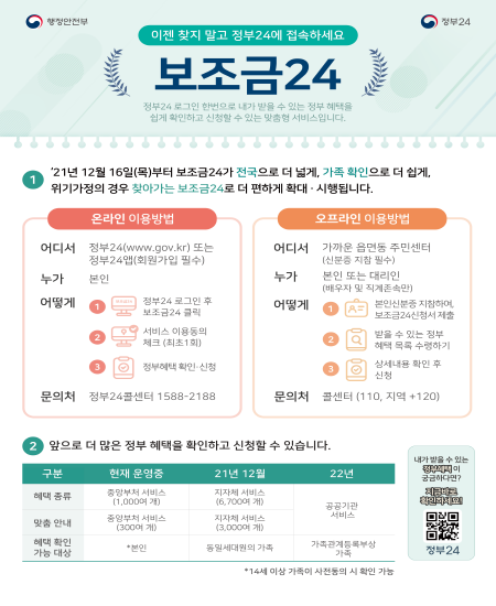 이번 시스템 도입으로 정부24 접속 및 가까운 읍·면 사무소 방문만으로 중앙부처에서 제공하는 아동수당, 의료지원 등을 받을 수 있다. 올해는 취약계층이나 위기가정을 직접 찾아가서 안내하는 찾아가는 보조금24 서비스를 시행할 예정이다.