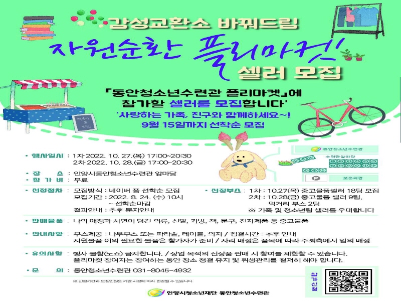 [안양시 소비자저널=장주연기자] 안양시청소년재단(이사장 최대호) 산하 동안청소년수련관(관장 이석구)은 지역주민이 직접 참여해 중고제품을 거래하고 자원순환을 실천하는 ‘자원순환마켓(플리마켓)’을 열고 판매자로 참여할 주민들을 모집한다.