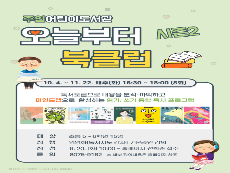 [안양시 소비자저널=장주연기자] 고양특례시(시장 이동환) 주엽어린이도서관이 오는 10월부터 어린이 독서토론 프로그램 「오늘부터 북클럽 시즌2」를 운영한다.