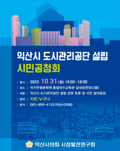 [전주시 소비자저널=최훈 기자] 익산시의회 시정발전연구회(대표의원 조규대)가 익산시에서 추진하고 있는 '익산시 도시관리공단' 설립과 관련, 시민공청회를 개최한다.