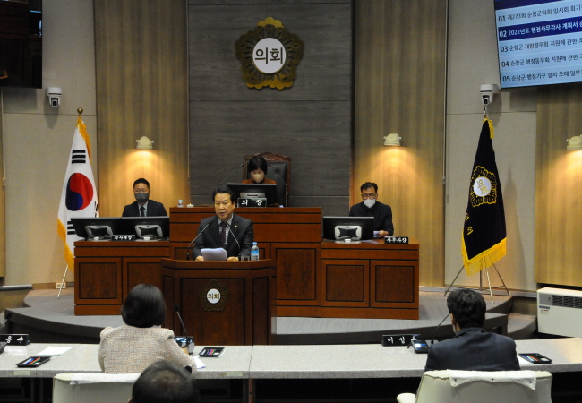 이번 임시회는 제1차 본회의를 열고 2022년도 행정사무감사 계획서를 승인, 순창군 행정기구 설치 조례 일부개정조례안과 의원발의 조례 4건을 의결했다.
