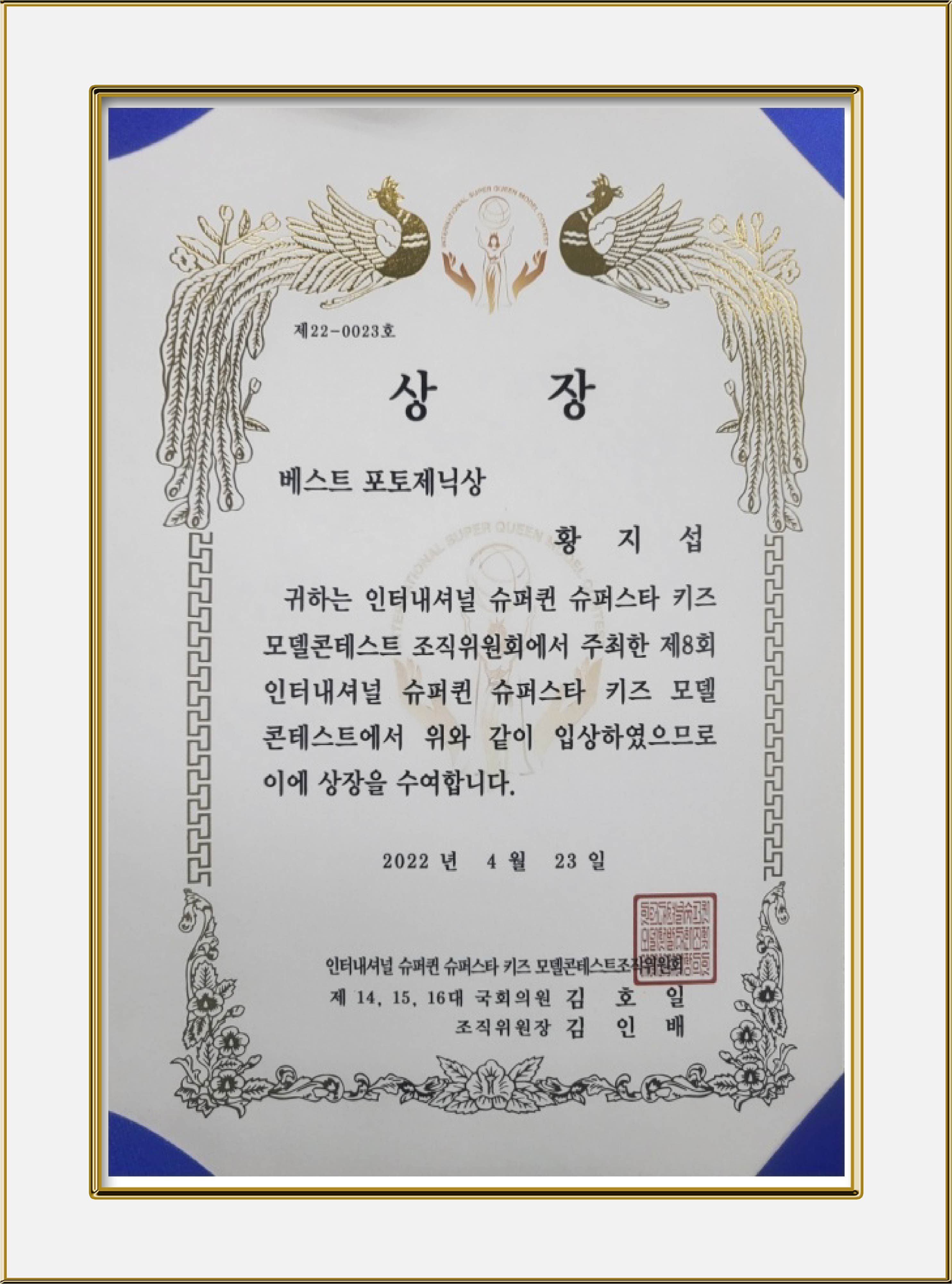 - 2022년 04월 23일 / 슈퍼스타키즈모델콘테스트패션쇼 베스트포토제닉상