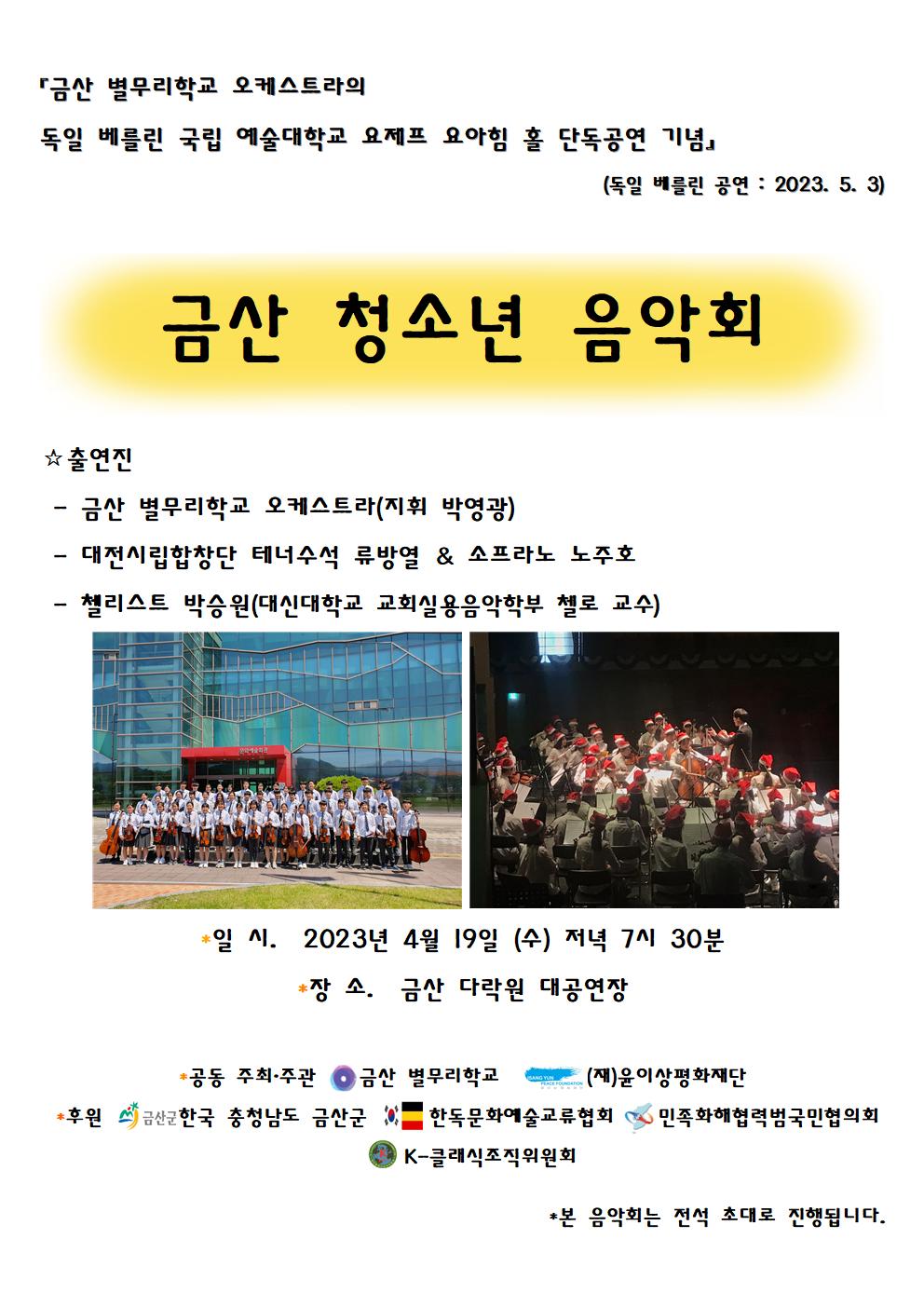 이는 국내외 학교 단위로는 유일하며 그 과정과 결과물들은 지역 문화예술 발전에 큰 영향력을 주고 있다. 특별히 오는 5월 3일 (수) 독일 베를린 국립 예술대학교 요제프 요아힘 홀에서의 공연은 대한민국 청소년 오케스트라 최초의 무대 이며, 별무리 오케스트라 40명의 학생 단원들과 독일 주요 음대에 재학 중인 한인 유학생들이 함께 한국 전통 민요인 "아리랑"을 포함하여 부랑스, 드보르작의 작품, 영화음악 등을 연주한다.