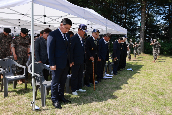 추념식은 오전 10시 전국 동시 사이렌 취명에 맞춰 제7733부대 장병들의 조총 발사와 함께 1분간 순국선열과 호국영령에 대한 추모 묵념을 시작으로 헌화·분향, 추념사, 헌시낭독과 현충일 노래 제창 순으로 진행됐다.