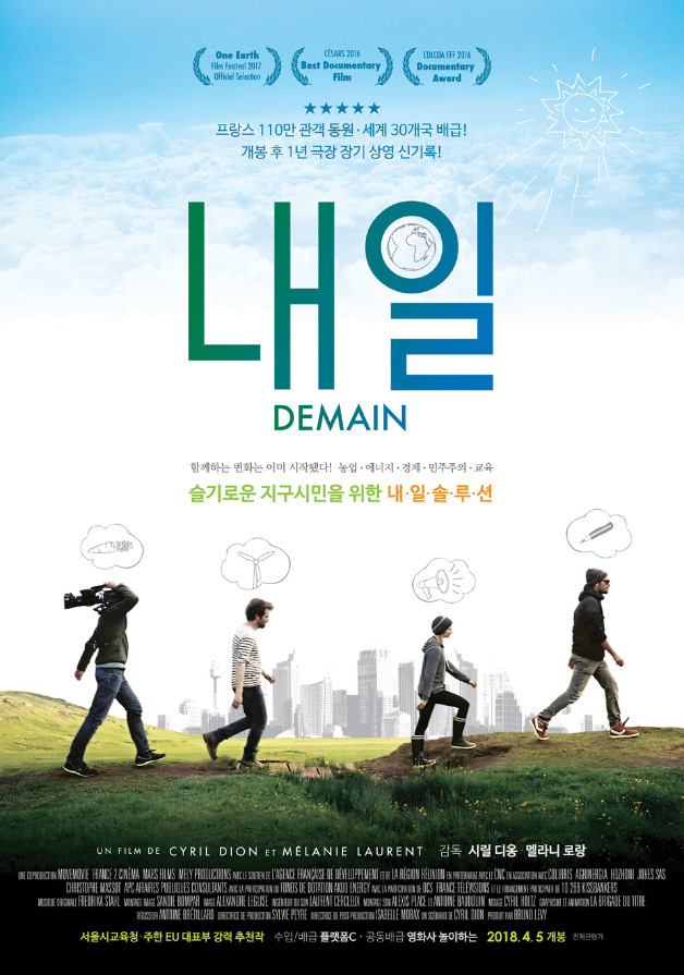 프랑스에서 다큐멘터리오 제작된 영화 ‘내일’(Demain)은 처음 내레이션으로 시작한다. 기후변화로 인해 2100년 이전에 인류의 다수가 멸망할 수 있다는 네이처 연구(2012년) 내용을 토대로 프랑스의 환경운동가 시릴 디옹과 프랑스 여배우 멜라니 로랑은 영화계 친구들과 뜻을 합쳐 만든 다큐멘터리 영화다. 이 영화는 2016년 프랑스의 아카데미로 불리는 세자르 영화제에서 다큐멘터리상을 수상하기도 했으며 수십 시간의 환경 교육을 단 한 편의 영화에 담아낸 수작이라 평가받았으며 세계 30여개국에 친환경 교육의 소재로 사용될 정도로 호응이 컸다.