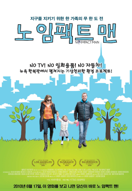 2009년도 제작된 영화 '노 임팩트 맨'은 뉴욕에 사는 콜린 베번 가족의 1년을 그린 영화다. 환경에 해를 끼치지 않고 살아보려는 콜린의 도전정신으로 가족들은 쓰레기 줄이기, 전기 안 쓰기, 공해 유발 않기 등 기초적인 것부터 서서히 단계를 높이며 환경 살리기 프로젝트를 감행한다.