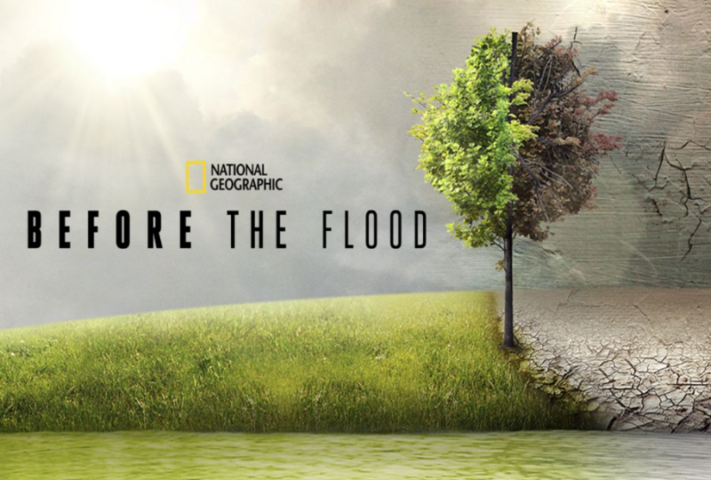 '비포 더 플러드'는 전세계가 직면한 기후변화 문제의 심각성을 생생하게 알리고, 이를 해결하기 위한 실질적인 방안을 심도 있게 다루었으며 2016년 토론토 국제 영화제에서 공개 당시 큰 호평을 받은 영화다. 디카프리오가 직접 5대륙과 북극을 오가며 기후변화 문제로 인한 환경 피해를 절실히 체감하고 있는 지역의 처참한 모습을 생생하게 보여 준다. 해수면 상승으로 수몰 위기에 처한 태평양의 섬나라 키리바티 공화국과 각종 생활용품의 재료로 쓰이는 팜유를 생산하기 위해 열대우림의 80%를 불태우며 엄청난 양의 이산화탄소를 발생시키는 인도네시아의 모습 등을 통해 기후변화로 인한 지구온난화가 실제 우리에게 닥친 위급한 상황이라는 것을 알리는데 힘을 썻다. 그는 약 3년 동안 세계 곳곳에서 발생하는 기후변화로 인한 환경재해를 직접 목격하고, 이를 뉴욕 UN 본부에서 열린 파리 기후변화 협정 서명식에서 인류의 즉각적인 행동을 촉구하는 연설에 나선 바 있다.