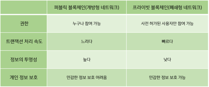 반대로 사전에 정해진 특정 사용자만 네트워크에 참여할 수 있는 프라이빗 블록체인은 정보의 투명성과 거래 내역에 대한 신뢰성이 낮아질 수 있으나, 트랜잭션 처리 속도가 빠르며 민감한 개인 정보 보호를 할 수 있다. 따라서 각 블록체인 도입 시 발생하는 기술적인 문제를 어떻게 해결할 것인지에 대해 계속 고민하고 개선해 나가야 할 것이다.
