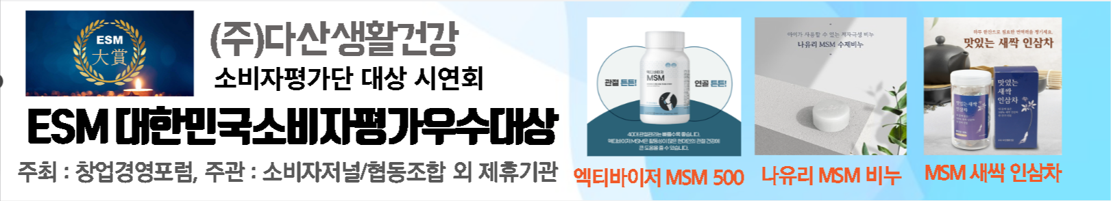 ESM 대한민국소비자평가우수대상 운영기관 비영리단체 창업경영포럼은 내달 2일 오후12시, 서초구 방배동 소재 소비자저널협동조합 이수공판장에서 ESM소비자평가단(전문가평가단)을 대상으로 (주)다산생활건강의 엑티바이저MSM정, MSM 인삼차, MSM 나유리 비누 등 3개 제품군에 대한 소비자평가 시연회를 개최할 예정이라고 밝혔다.