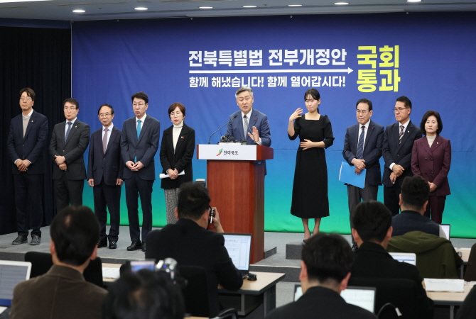 전북도는 12일 도청 기자회견장에서 김관영 도지사를 비롯해 한병도 더불어민주당 전북도당위원장과 양경숙 더불어민주당 의원, 국민의힘 정운천 의원 등이 참석한 가운데 전북특별법 전부개정안 국회 본회의 통과에 대한 브리핑을 갖고 도민들에게 감사 인사를 전했다.