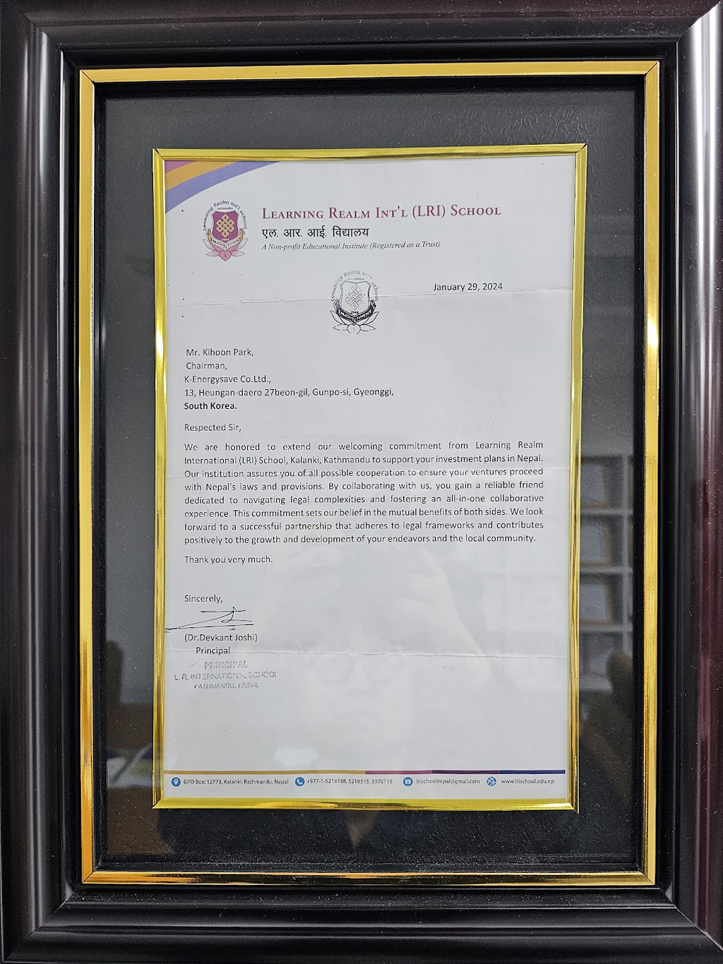케이에너지세이브(주) 네팔 LEARNING REALM INT’S(LRI) SCHOOL 지원 및 협력