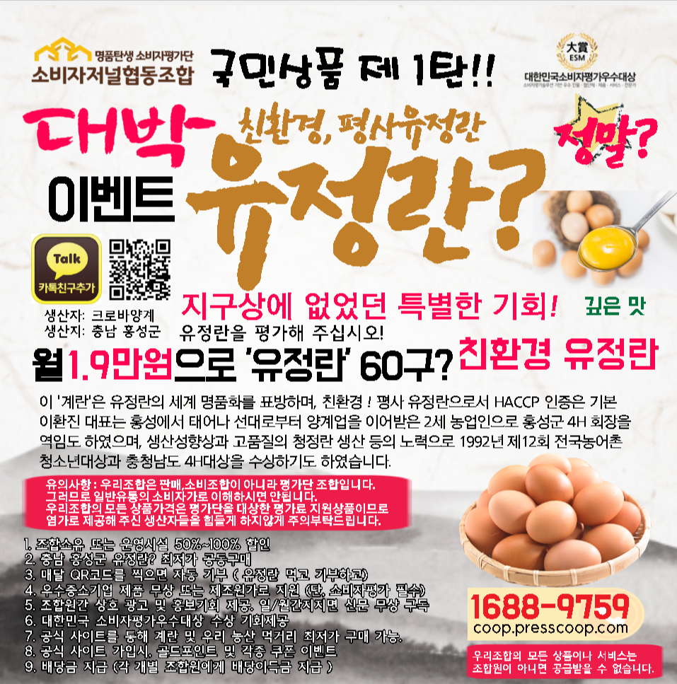 | 소비자저널협동조합 - 유정란 정기구독 ( 소비자평가단 자격 보유자에 한함. ) (0) | 2023.11.30 |