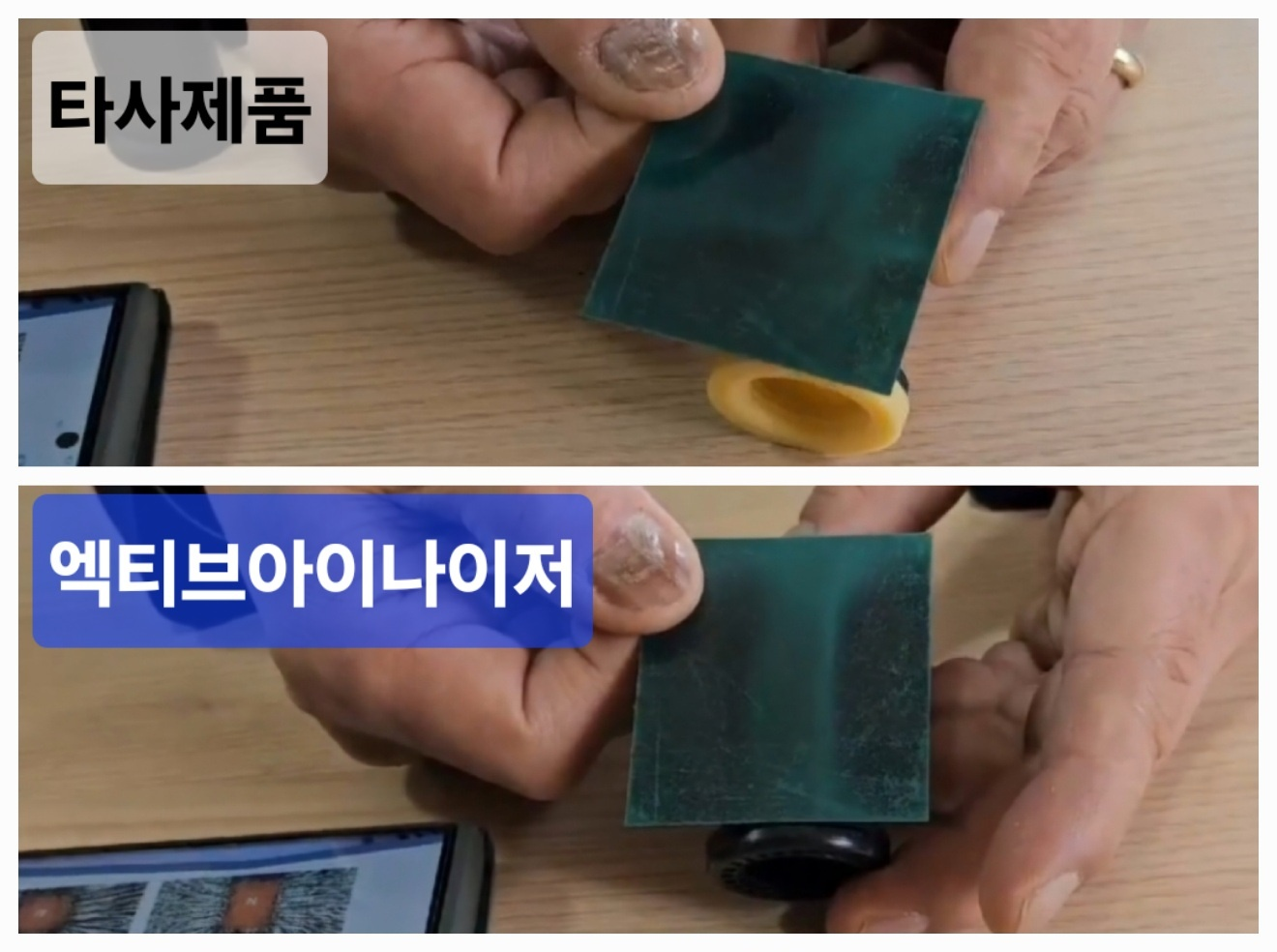 (주)아리움은 신 대표는 "막대 자석에서는 자력이 둥글게 흐르고 N.S극에서는 평범하게 흐르는 자석의 모습을 보이는데 (주)아리움 엑티브아이나이저는 N극 끼리 강력하게 자력이 흐르는 모습을 볼 수 있다"고 설명하며 "타사제 제품에서는 자력선이 옆으로 가로로 찢어지는 모습을 볼 수 있고 옆모습에서는 십자가 모양으로 자력이 흐르는 반면, 엑티브아이나이저 N극과 N극이 배치된 것을 보면 제품은 가운데는 차단이 되어 있으면서도 굉장히 원만히 잘 돌고 있는 모습을 볼 수 있고, 옆모습을 보면 자력선이 수로쪽으로만 자력이 일직선으로 뚜렷하게 내려가는 것이 보인다"며 자기장 테스트를 통해 제품의 우수성을 증명했다.