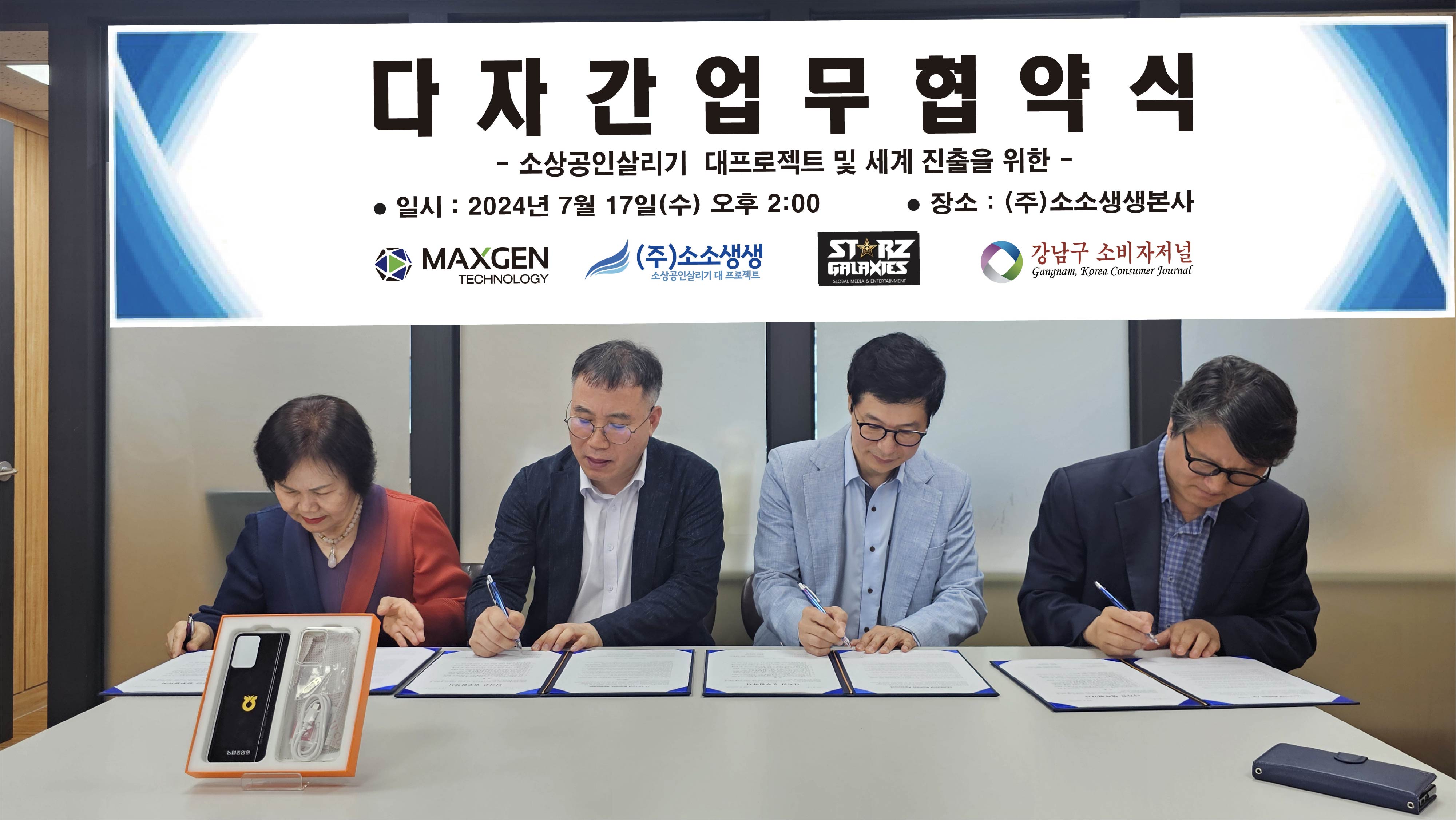 ㈜맥스젠테크놀로지(대표이사 김영수), (주)소소생생(대표 김영명) , STARZ GALAXIES GLOBAL & ENTERTAINMENT(대표 오승용) , 강남구 소비자저널(발행인 김은정)은 상호 이해와 신뢰를 바탕으로 협력하고자 업무협약서에 각각 서명했다.