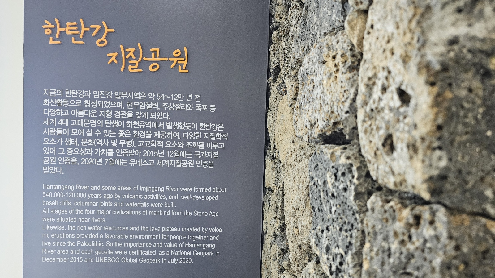 세계 4대 고대문명의 탄생이 하천 유역에서 발생했듯이 한탄강은 사람들이 모여 살 수 있는 좋은 환경을 제공하여, 다양한 지질학적 요소가 생태, 문화(역사와 무형), 고고학적 요소와 조화를 이루고 있어 그 중요성과 가치를 인정받아 2015년 12월에는 국가 지질 공원 인증을, 2020년 7월에는 유네스코 지질공원 인증을 받았다.