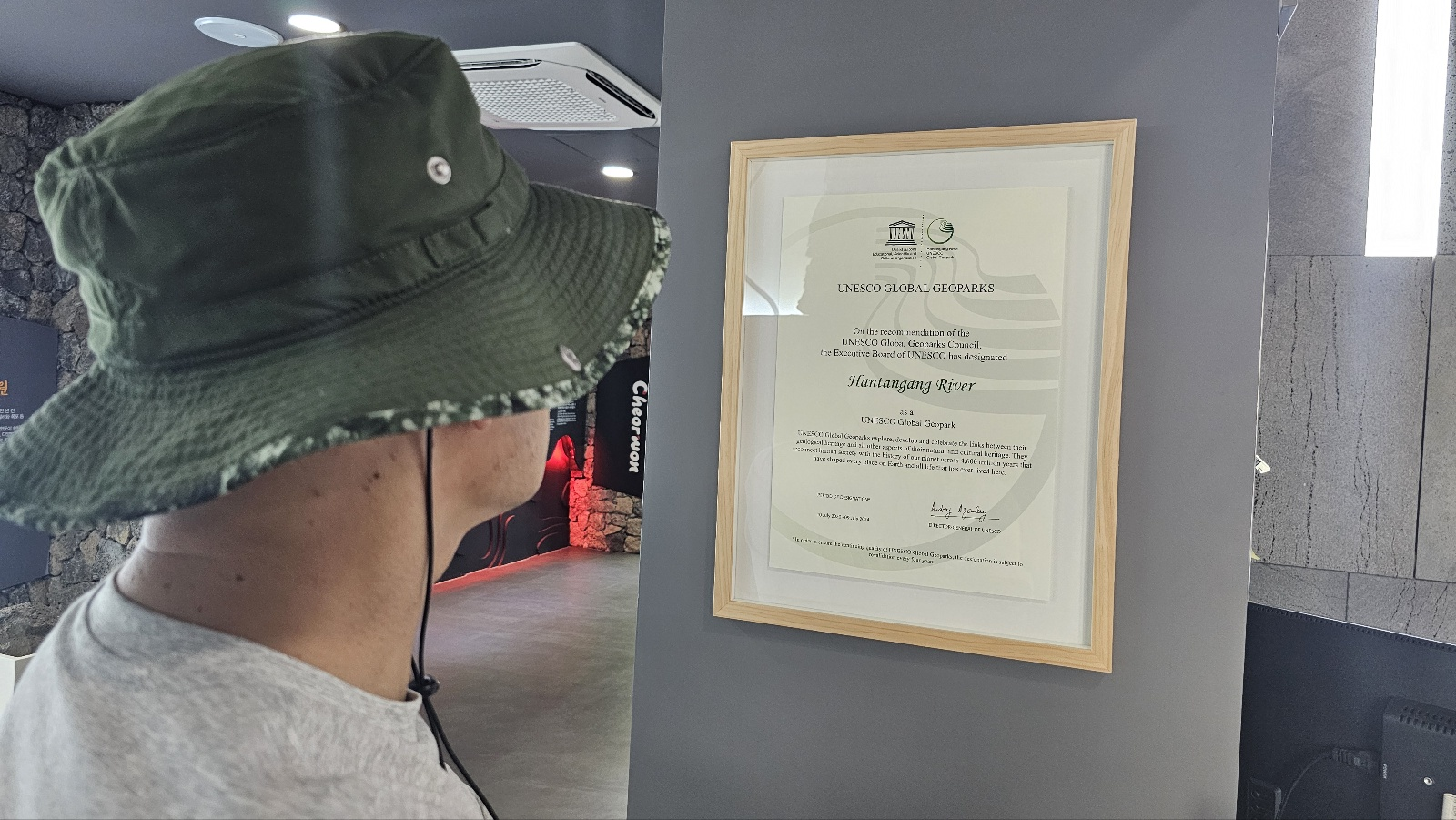 점심시간 점심을 포기하고 방문한 "한탄강 지질공원 방문자센터"에서 무더위를 피하고 시원함과 함께 값진 정보들을 얻을 수 있었다. 노령의 해설자로 부터 역사적 배경과 함께 한탄강 지질공원에 대한 전반적인 설명을 들을 수 있었다.