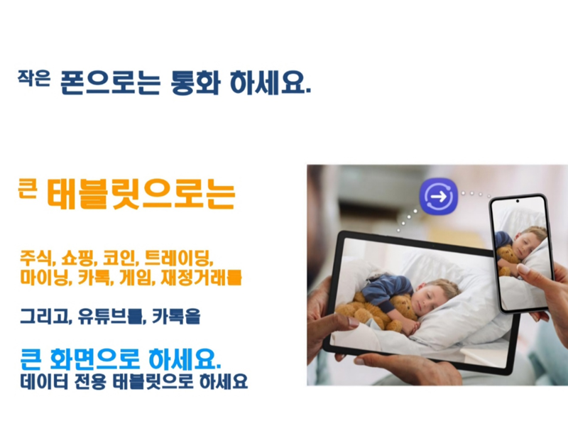 "작은 폰으로 통화하고 큰 테블릿으로는 주식, 쇼핑, 코인, 트레이닝, 마이닝, 카독, 게임, 재정거래를 그리고, 유튜브를 카톡을 큰 화면으로 하세요"라고 홍보한다.