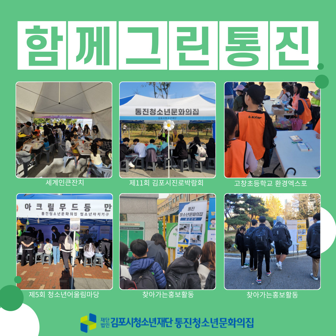 마을연계사업 ‘함께그린통진’은 9월 29일(일) 세계인큰잔치에 참여하여 김포에 사는 내‧외국인들이 서로의 문화를 공유하고 이해하는데 동참하고자 LED에펠탑만들기 체험부스를 운영하였고, 10월 17일(목) 제11회 김포시 청소년진로박람회에 참여하여 정보공유존에서 아크릴무드등만들기 체험부스를 운영하며 통진청소년문화의집을 홍보하고 참여 청소년들과 소통하는 시간을 마련했다. 또한 10월 18일(금) 고창초등학교에서 진행하는 환경엑스포에 참여하여 업사이클링 커피박키링만들기 체험부스를 운영하며 통진청소년문화의집의 환경특성화를 알리는 기회가 되었고, 10월 26일(토) 제5회 청소년어울림마당에 참여하여 크리스마스 오너먼트 꾸미기와 아크릴무드등만들기 체험을 진행하며 문화놀이터의 역할을 하였다.