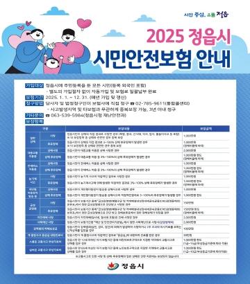 정읍시에 주소를 둔 시민이라면 별도의 절차 없이 자동으로 보험에 가입되며 보험기간 중 전입자도 혜택을 받을 수 있다.