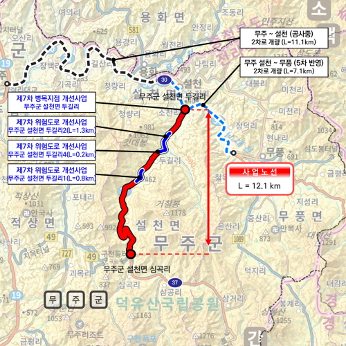특히 제4차 국도·국지도 건설계획에 반영돼 공사가 진행 중인 무주~설천 구간과 제5차 건설계획에 반영돼 실시설계 중인 설천~무풍 간 도로의 마지막 연장선이라는 점에서 기대를 모으고 있다.