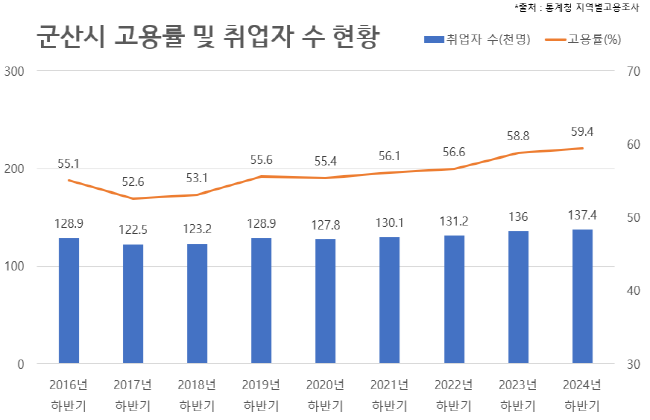 지난 20일 통계청이 발표한 ‘2024년 하반기 지역별 고용조사’ 결과에 따르면 군산시는 2024년 고용률 59.4%로 전년동기 대비 0.6% 포인트(p) 중가했으며, 취업자는 13만 7천명으로 전년동기 대비 1천 4백명(1.02%) 증가했다.