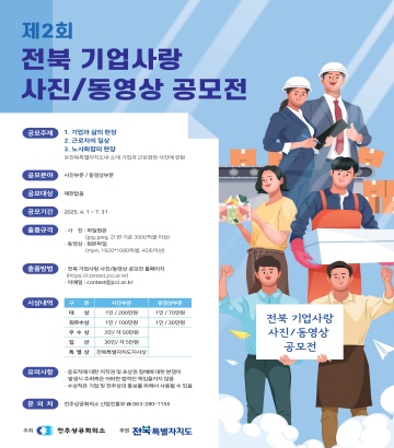 김정태 전주상의 회장은 “사진 동영상 공모전을 통해 전북자치도내 기업환경 개선과 노사화합 분위기 제고로 기업 이미지를 개선하고 지역경제 활성화를 꾀하는데 목적을 두고 있다”며 “도민들의 많은 관심과 참여를 기대한다”고 말했다.
