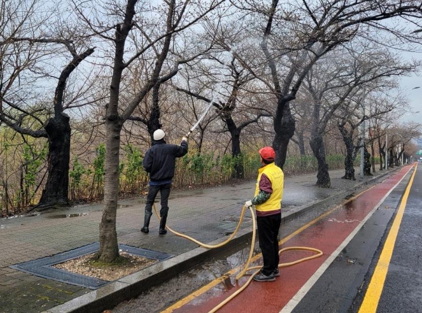 겨울철 도로변 가로수 보호를 위해 설치했던 제설제 차단막을 철거하고, 겨우내 쌓인 낙엽과 오염물질 등을 제거해 가로환경을 정돈한다. 또한 제설제 잔여물로 인해 발생할 수 있는 나무 뿌리와 줄기, 가지의 염해를 방지하기 위해 수목을 세척하며, 이 과정에서 생육 상태도 점검할 예정이다.