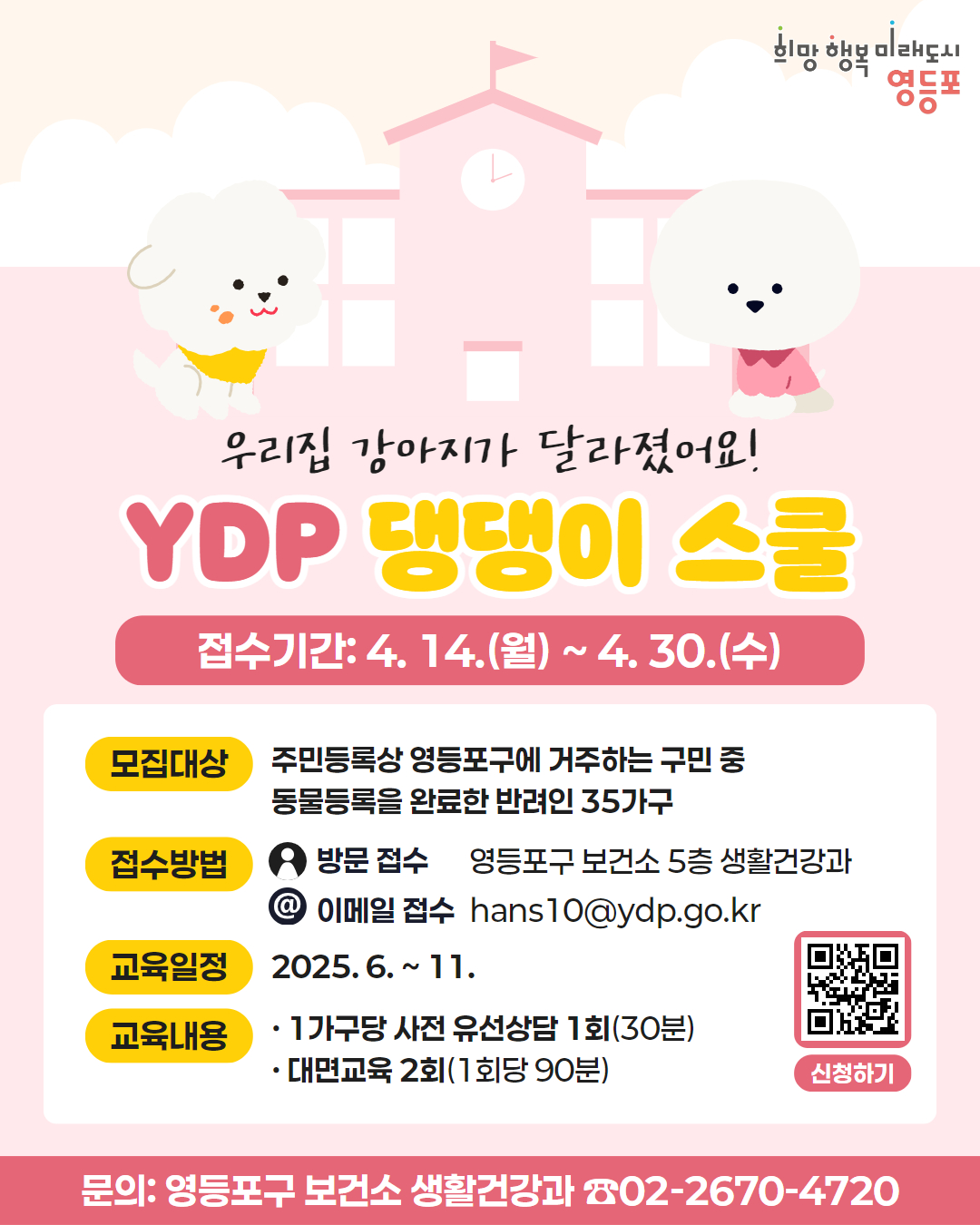영등포구(구청장 최호권)가 성숙한 반려문화 정착을 위해 문제행동을 가진 반려견을 대상으로 찾아가는 훈련 프로그램 'YDP 댕댕이 스쿨'을 신규 운영하고, 4월 30일까지 참여 가구를 모집한다고 밝혔다.
