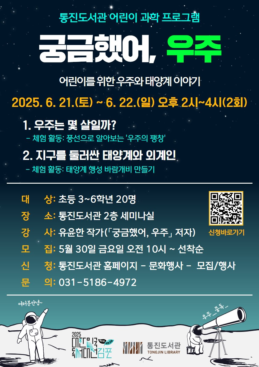 ‘궁금했어, 우주’는 관내 초등학교 3~6학년 어린이를 대상으로 하며, 통진도서관 2층 세미나실에서 6월 21일(토)과 6월 22일(일) 오후 2시부터 4시까지 2회 진행한다.