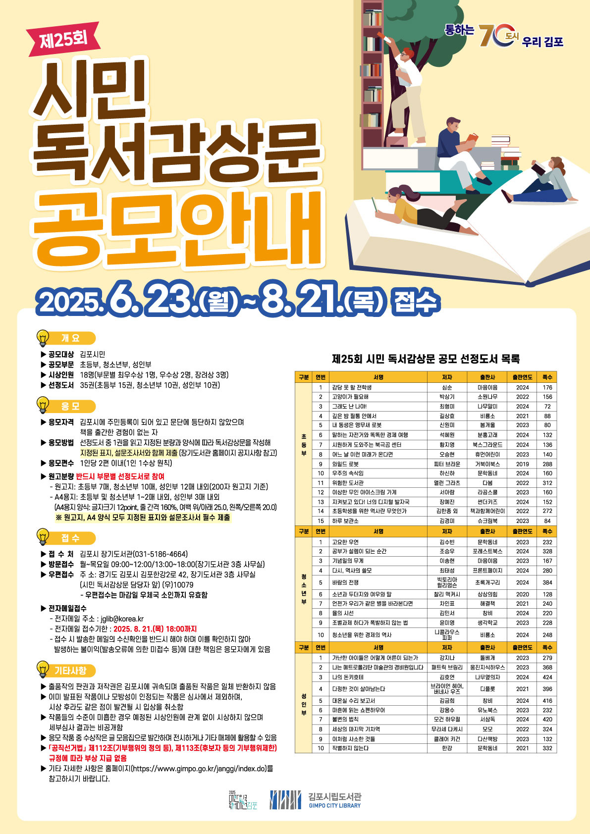 제25회 시민 독서감상문 공모와 관련한 자세한 사항은 장기도서관 홈페이지(http://www.gimpo.go.kr/janggi/index.do)를 참고하거나 장기도서관(☎031-5186-4664)으로 문의하면 된다.
