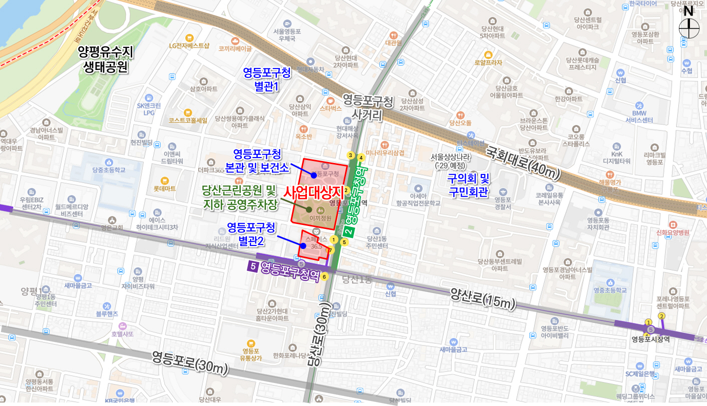 또한 구는 구청‧구의회 부지에 공개공지 조성을 통해 지하철 2‧5호선 영등포구청역과 당산근린공원을 연결하는 보행 네트워크를 구축하여, 보행 편의를 높이고 녹지 공간도 확충할 방침이다. 이와 함께 신청사 인근 도로(당산로 27길) 확장과 통행 체계 재정비, 보행로 설치 등을 통해 차량 흐름과 보행 안전을 동시에 확보한다.
