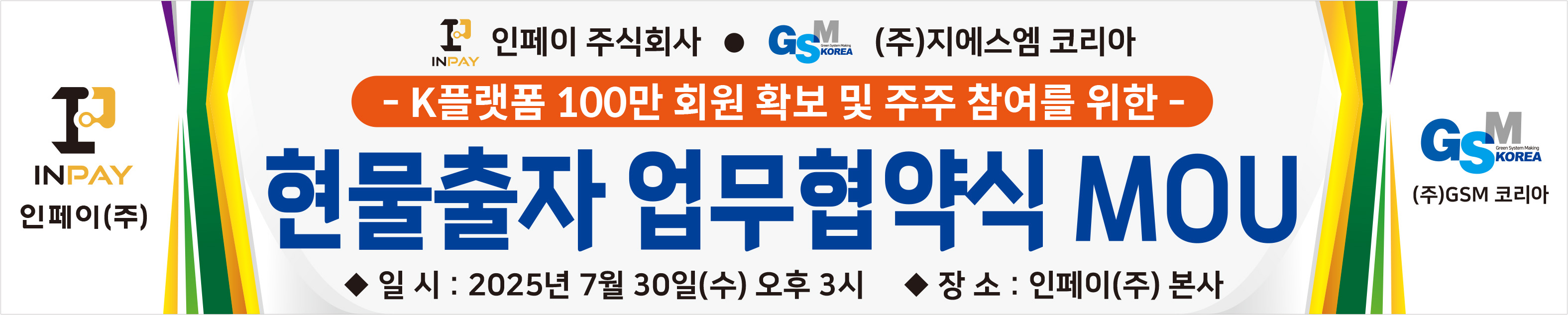[강남 소비자저널=정현아 기자] 인페이 주식회사와 (주)지에스엠 코리아가 오는 2025년 7월 30일(수) 오후 3시, 인페이(주) 본사에서 K플랫폼 100만 회원 확보 및 주주 참여 확대를 위한 현물출자 업무협약(MOU)을 체결한다.