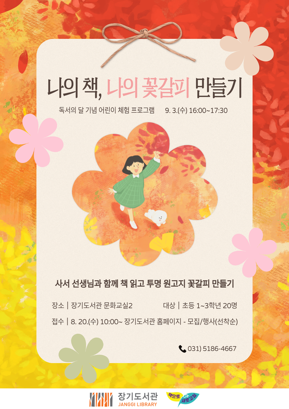 [김포시소비자저널=홍완호 대표기자] 김포시 장기도서관(시장 김병수)은 오는 9월 3일에 장기도서관 문화교실에서 9월 독서의 달을 기념해 어린이 체험 프로그램 ‘나의 책, 나의 꽃갈피 만들기’를 운영한다고 밝혔다.