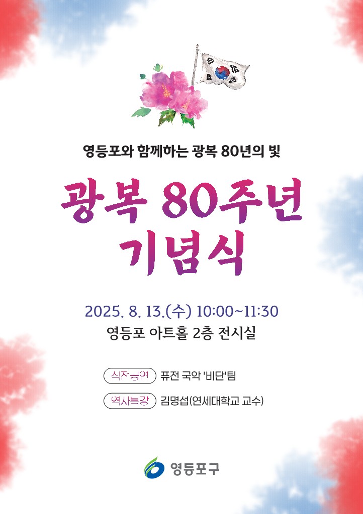 공식 기념식은 8월 13일 오전 10시, 영등포 아트홀 전시실에서 개최한다. 식전공연을 시작으로 ▲광복 80주년 기념영상 상영 ▲감사장 전달 ▲명사초청 특강 등이 진행돼, 참석자들에게 뜻깊은 시간을 선사할 예정이다.