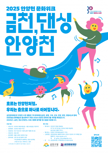 금천문화재단(대표이사 서영철)은 오는 8월 24일까지 ‘2025 안양천 문화위크-금천, 댄싱 안양천’에 함께할 지역 댄스팀을 공개 모집한다고 밝혔다.