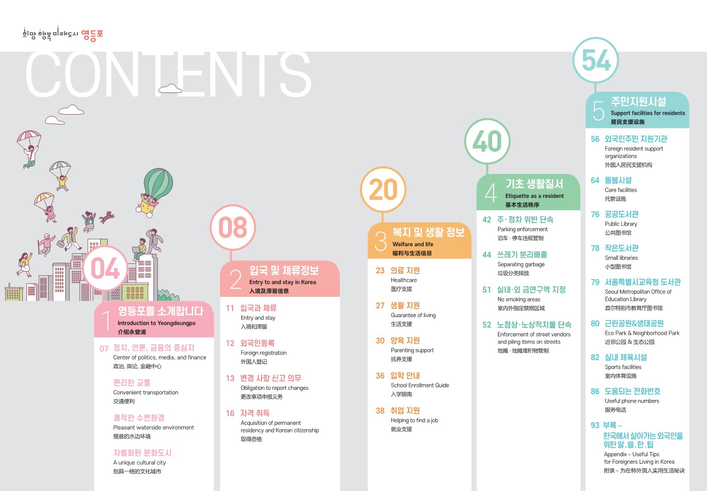 올해 책자에는 주민지원 시설 정보를 최신화하고, 한국에서 살아가는 외국인을 위한 한국식 인사법, 식사 예절 등 한국 생활의 유용한 정보를 새로 추가했다.