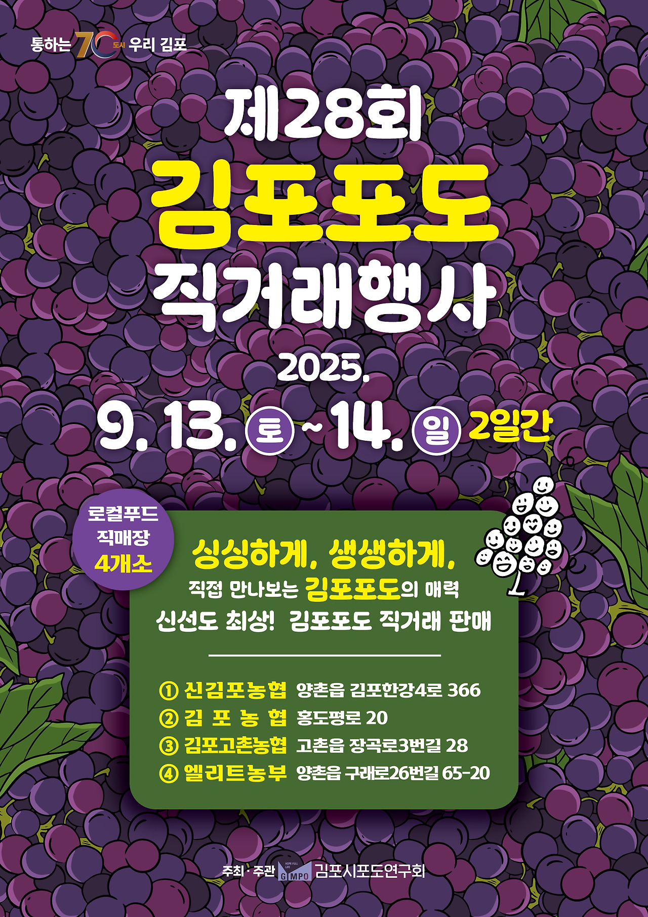 [김포시소비자저널=홍완호 대표기자] 김포시는 오는 9월 13일과 14일, 10월 18일과 19일. 신김포·김포·김포고촌 농협 및 엘리트농부 로컬푸드 매장에서 제28회 김포포도 직거래장터를 개최한다고 밝혔다.