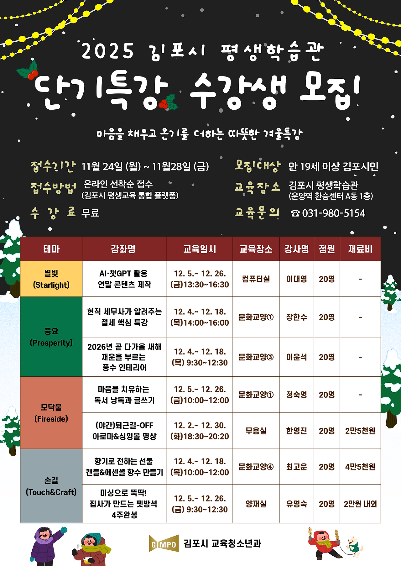 [김포시소비자저널=홍완호 대표기자] 김포시(시장 김병수)는 ‘따뜻한 연말’을 주제로 시민의 정서적 힐링과 실생활에 유용한 학습 기회 제공을 위해, ‘2025년 하반기 평생학습관 단기특강 수강생’을 오는 11월 24일부터 선착순으로 모집한다.