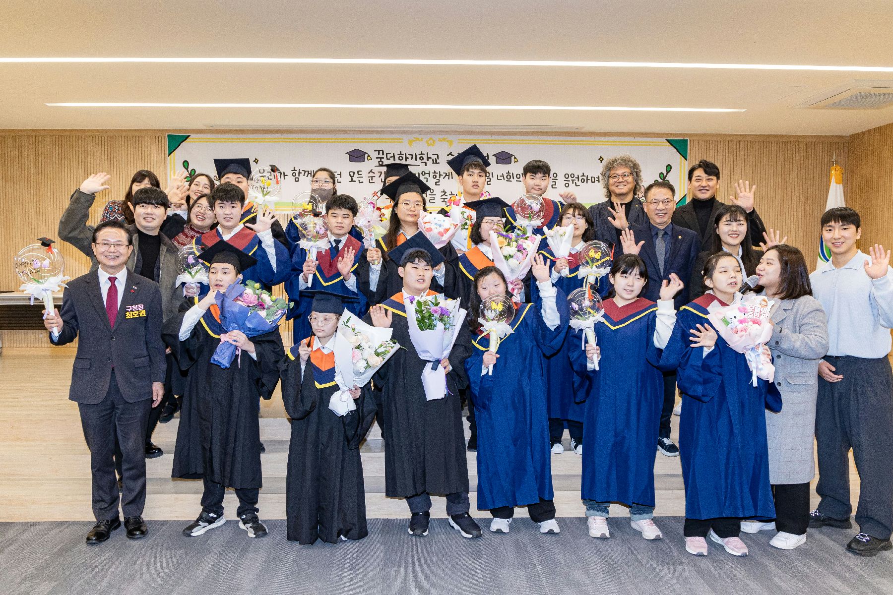 이날 수료식에서는 총 17명의 학생이 수료했으며, 행사장에는 학생 개개인의 성장 과정을 한눈에 볼 수 있도록 개인별 전시 부스를 마련하여 1년 간의 학습 성과를 공유했다. 전시 공간에는 개인 작품과 학습 과정이 담긴 문제집, 꿈더하기학교 교사들이 학생들의 눈높이에 맞춰 자체 제작한 교재 자료가 전시·공유되어 큰 관심을 받았다.