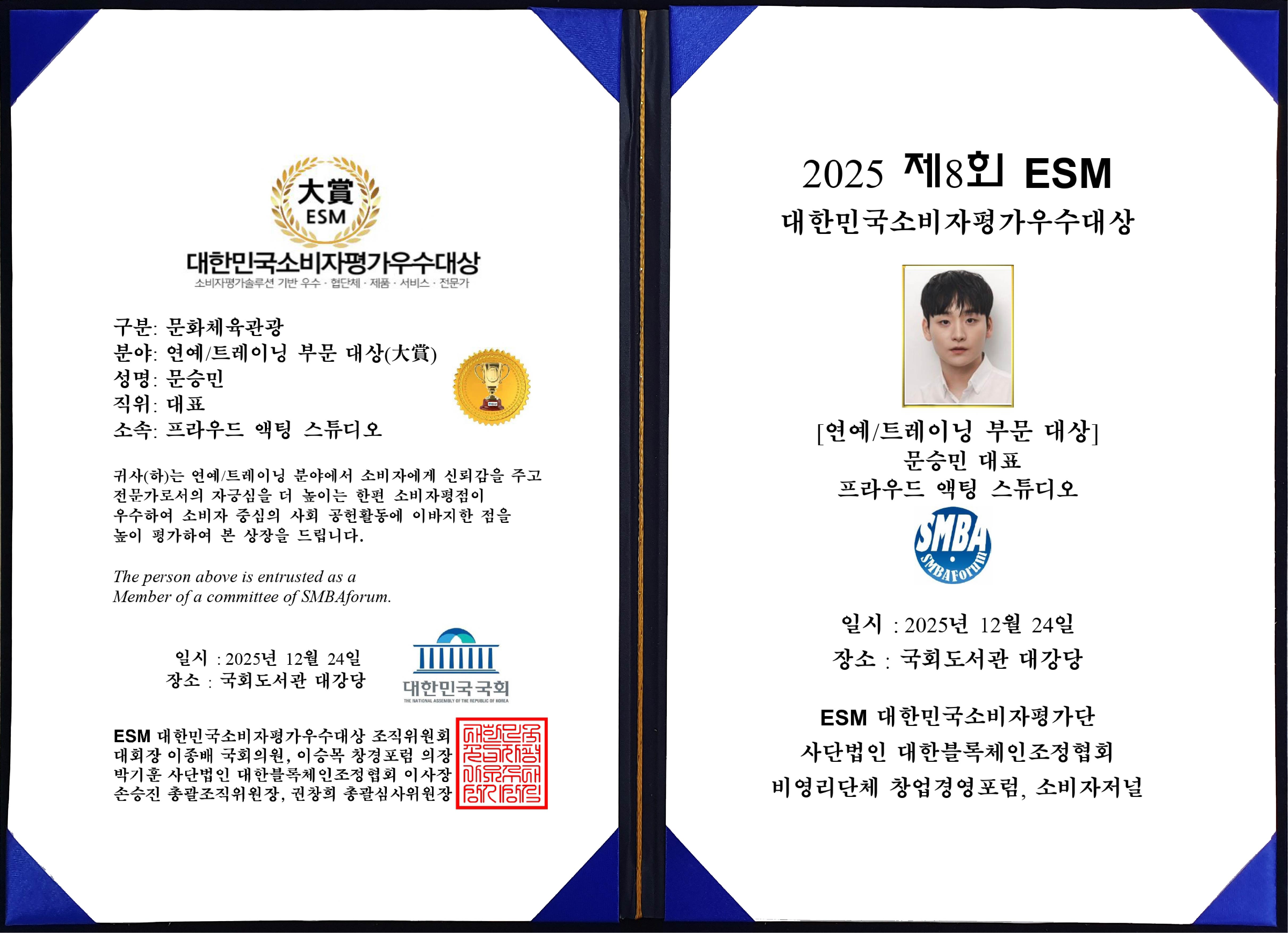 프라우드 액팅 스튜디오의 문승민 대표가 지난 12월 24일 국회도서관 대강당에서 열린 ‘2025 제8회 ESM 대한민국소비자평가우수대상’ 시상식에서 연예·트레이딩 부문 대상을 수상했다.