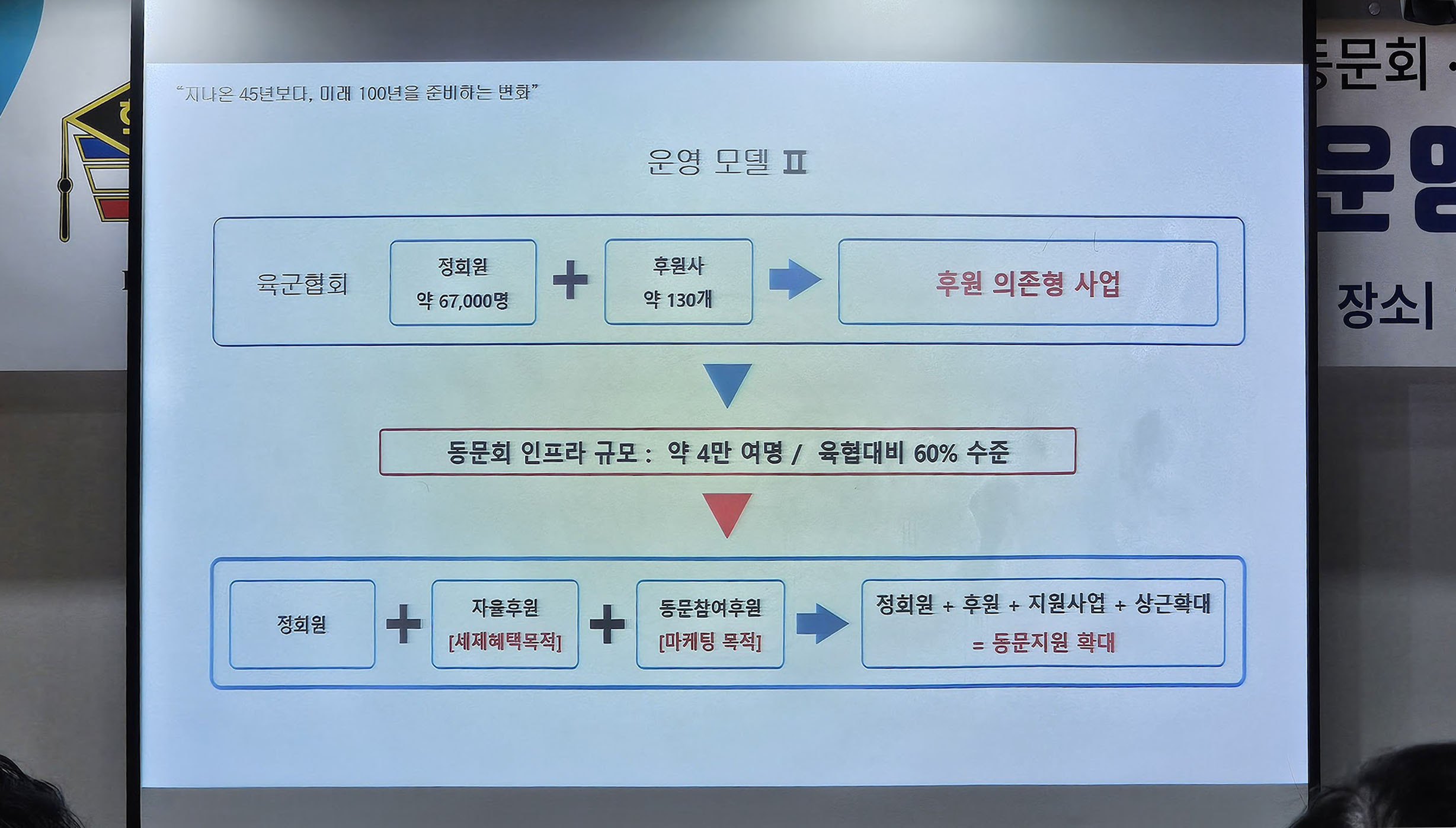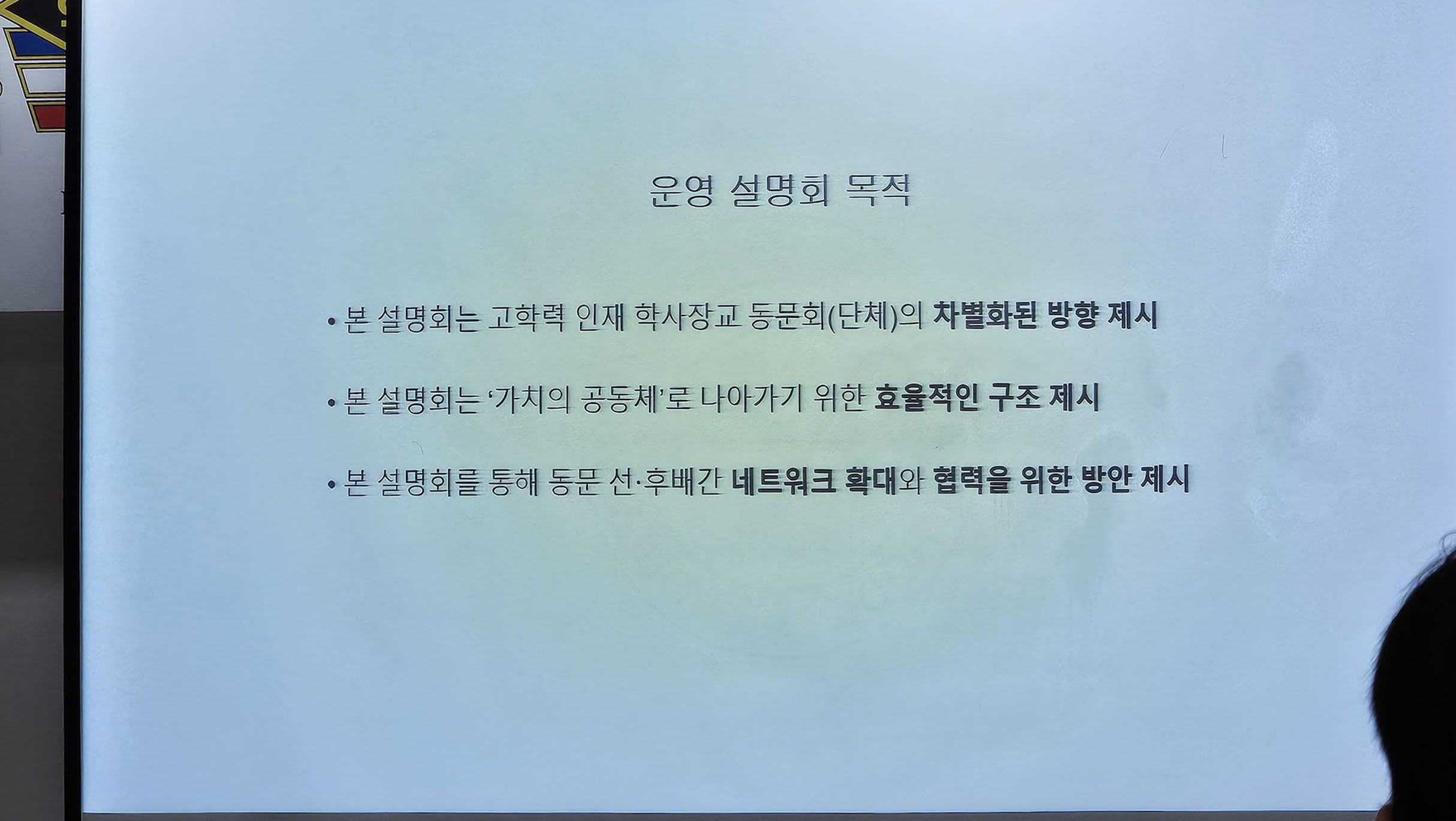 이번 설명회는 학사장교 창설 45주년을 맞아, 기존 친목 중심 동문회를 넘어 ‘가치의 공동체’로 전환하기 위한 중장기 전략을 공유하는 자리로 마련됐다.