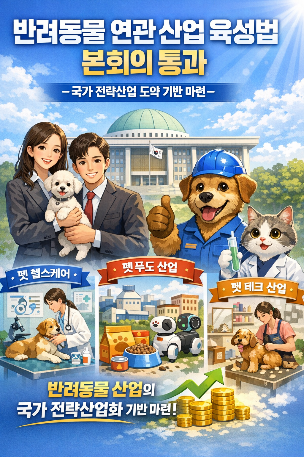 반려동물 연관 산업을 국가 차원에서 체계적으로 육성·지원하기 위한「반려동물 연관산업의 육성 및 관리에 관한 법률(반려동물 연관 산업 육성법)」이 12일 국회 본회의를 통과했다. 반려동물 산업이 독립된 정책 대상 산업으로 법적 기반을 갖추게 됐다는 점에서 의미가 크다.