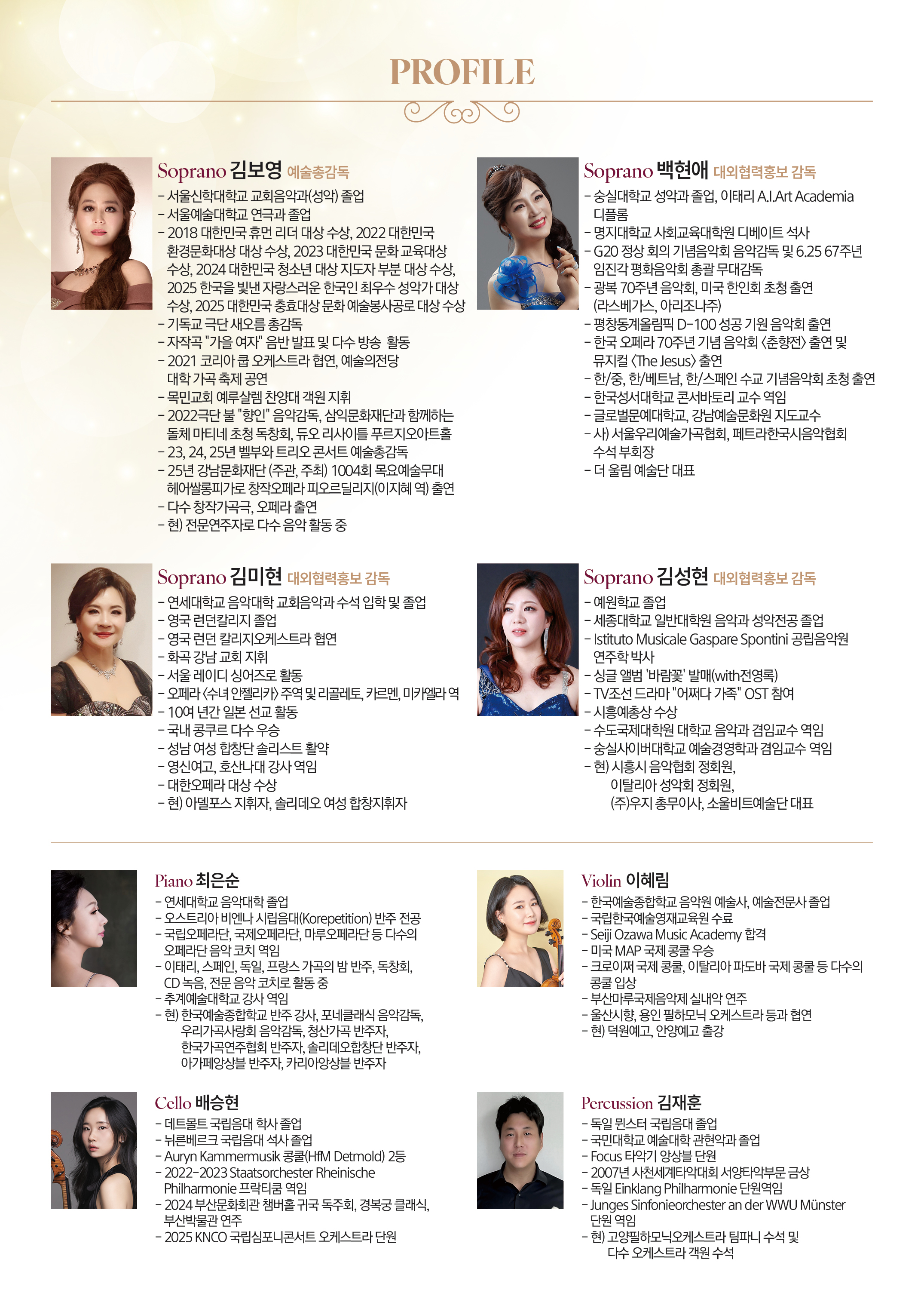 이번 <Four Divas> 콘서트는 이러한 디바의 전통을 계승하며, 동시에 한국 성악의 오늘을 보여주는 자리다. 특히 예술총감독을 맡은 김보영을 필두로 대외협력홍보감독으로 활동 중인 김미현, 김성현, 백현애 등 화려한 프로필을 자랑하는 중견 성악가들이 각자의 해석과 색채를 아낌없이 펼쳐 보인다는 점에서 그 무게감이 남다르다.