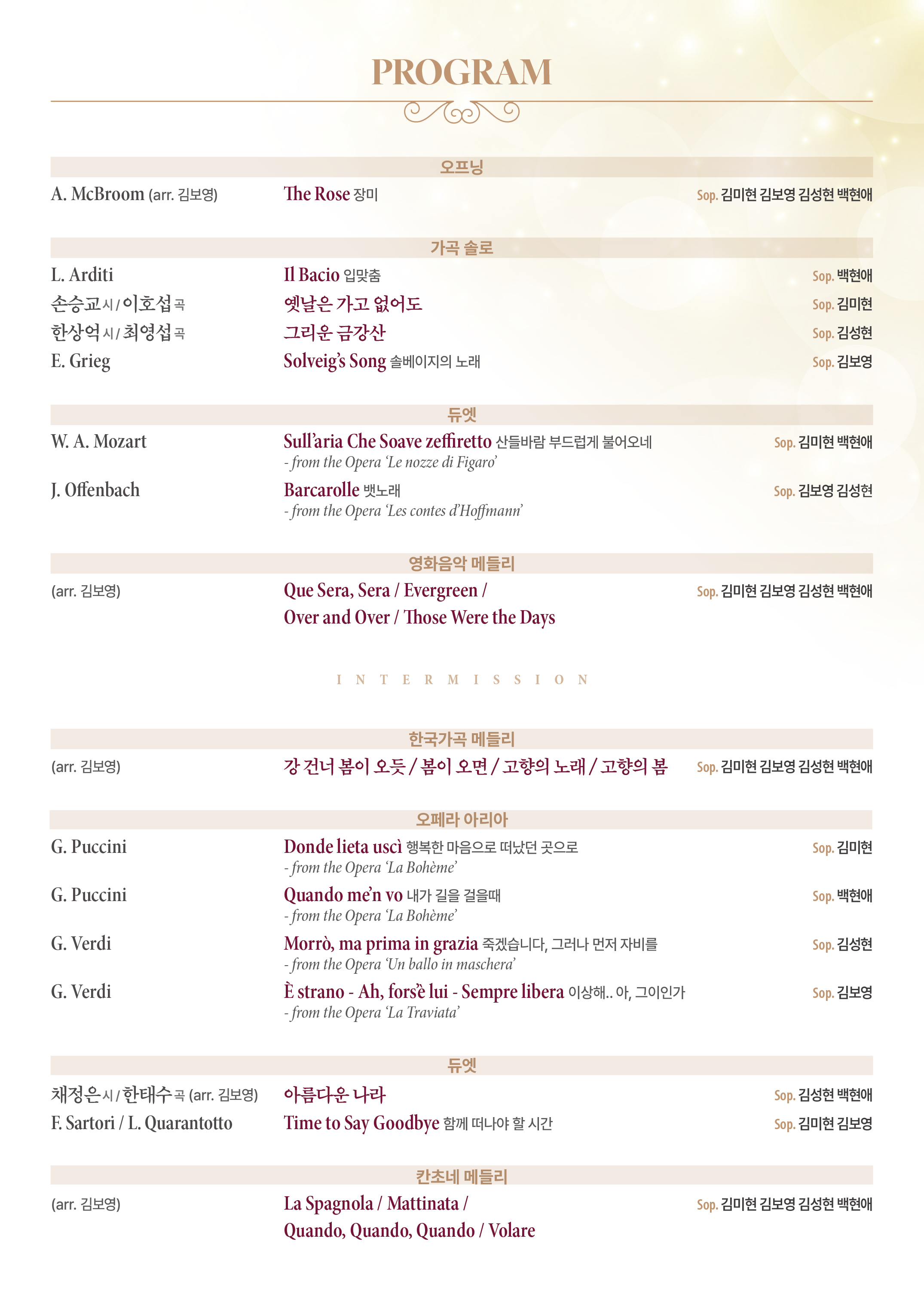 • 출연 Sop. 김보영, 김미현, 김성현, 백현애 / Pf. 최은순, Vn. 이혜림, Vc. 배승현, Per. 김재훈