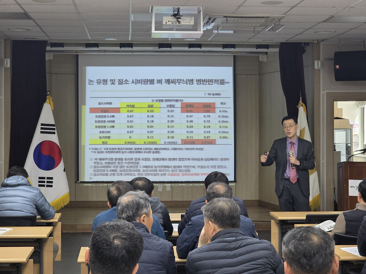 교육은 작년 전국적으로 많은 피해를 준 깨씨무늬병의 발병원인과 해결방법, 벼 육묘시 키다리병 예방과 소독방법 개선 등 현장의 애로사항을 묻고 답하는 방식으로 진행돼 큰 호응을 얻었다. 특히 깨씨무늬병 예방을 위해 양분이 부족한 논과 작년에 증상이 있었던 논은 볏짚 등 유기물 투입, 규산 시비 및 시비량을 증대해 줄 것과 적기기앙(김포의 경우 5.20~5.30)을 해줄 것 등을 당부했다.